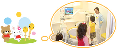 お子様にあった歯ブラシやフロス(糸ようじ)を選んだり、汚れが残りやすいところを見つけて、みがき残しがないように歯みがきできるポイントを指導します。おやつの内容や、生活リズムについてもお話して虫歯ゼロをめざします。